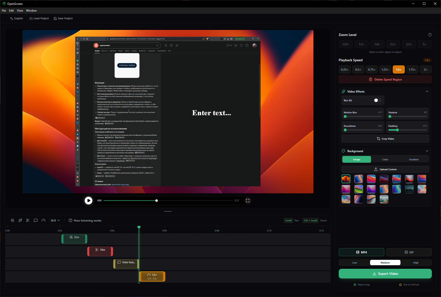 После записи Вам открывается мини монтажная студия, которая позволяет сделать зум, замедлить, обрезать и нанести текст или картинку поверх видео.